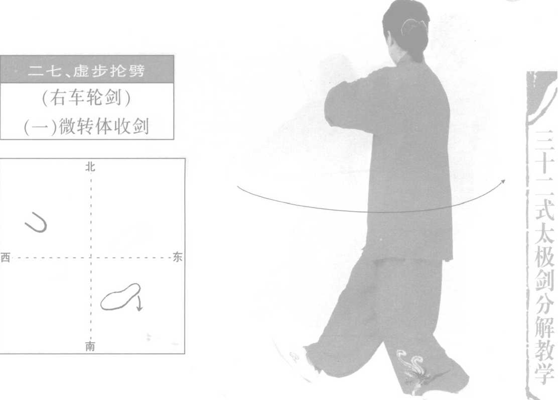 右手向后抡剑时,身体后转幅度大,腰要拧,将剑尖抡向正后方(东)。