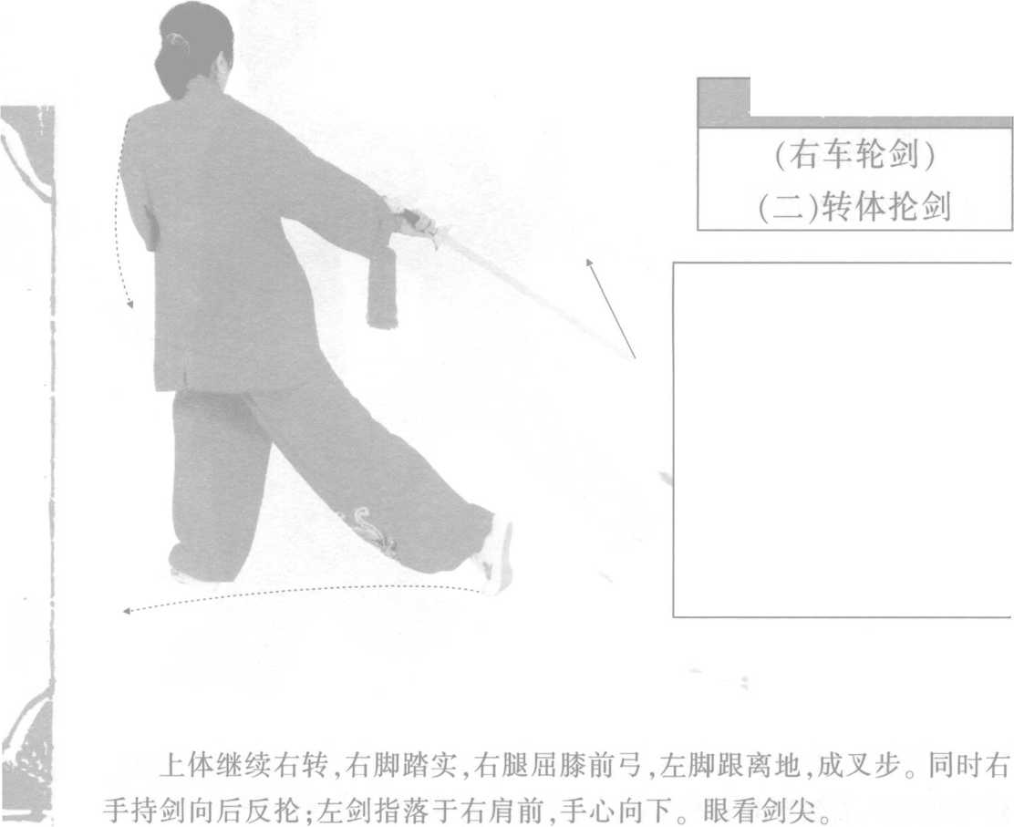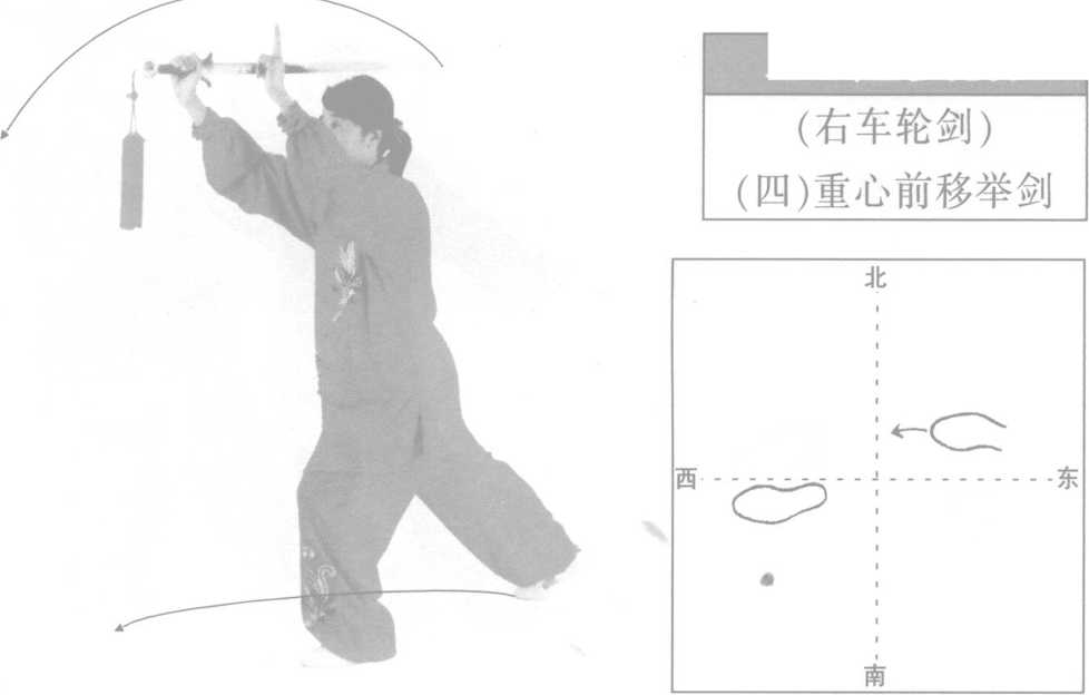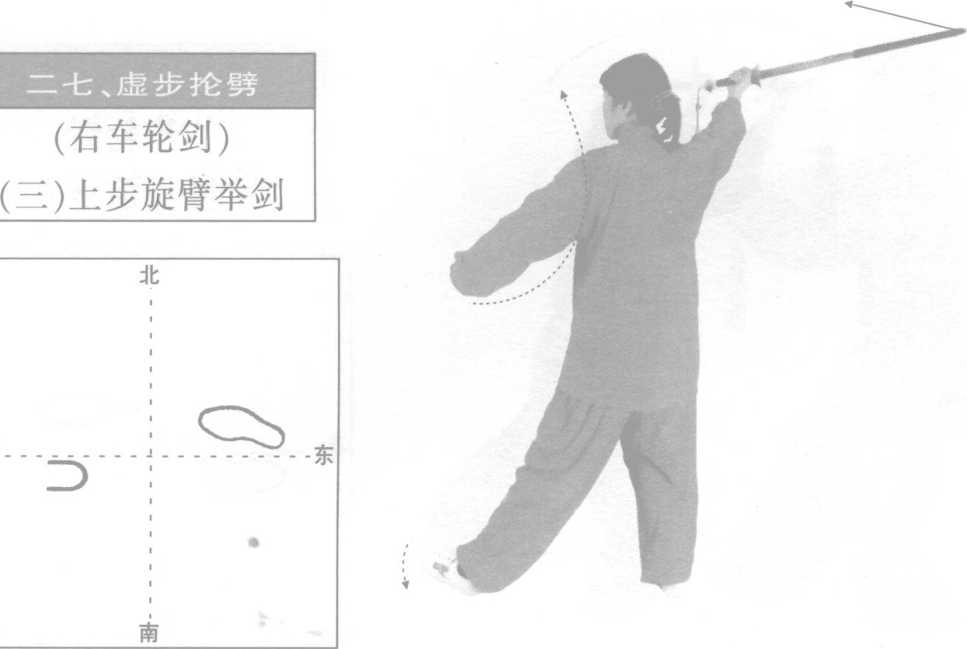 转体旋臂协调一致,右臂外旋时左臂同时外旋。翻臂举剑时,臂在原位 翻转上举,注意剑尖不要摆动,保持剑尖朝东方向不变。