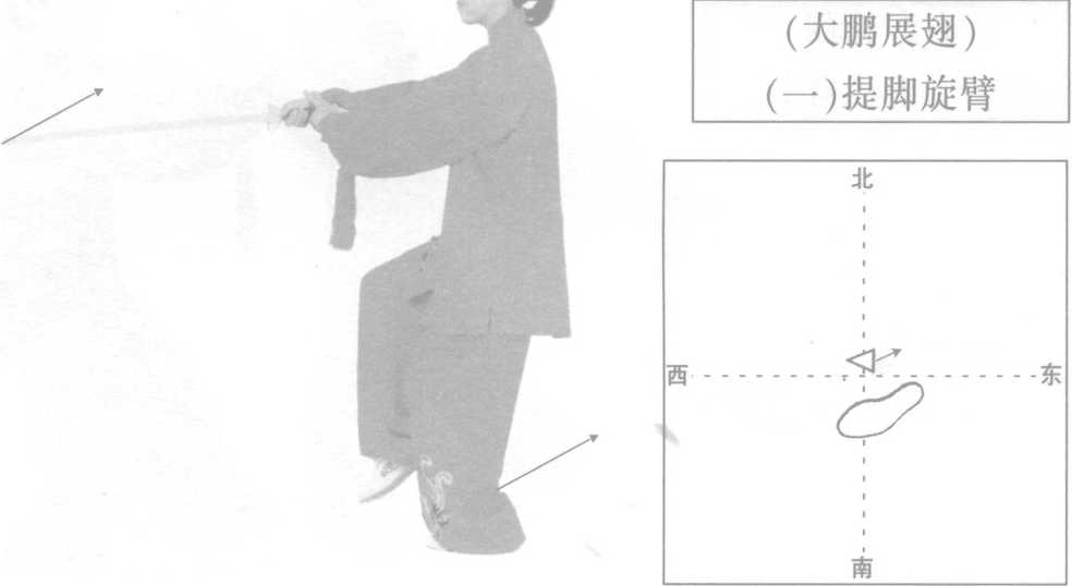 上体微右转,右脚提起至左小腿内侧。同时右臂外旋,手心斜向上;左 剑指附于右腕部。眼看剑尖。