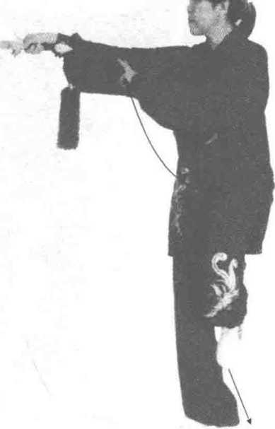 重心前移,右脚踏实,右腿屈膝前弓,左腿蹬直,成右弓步。同时右手持 剑向右前方劈下;左剑指向左、向上绕至左额上方,手心斜向上。眼看剑尖。弓步和劈剑的方向是中线偏右(西偏北)30%劈击和弓步要同时,协调 一致。劈剑时,剑要劈平,剑身与臂成一条直线,力在剑刃中段,防止剑尖下 落做成点剑。随重心前移呼气,定势时呼气止。攻防含义:向对方头部劈击。(天马行空)十八、落指收脚(天马行空)十八、落指收脚二四、虚步点剑二四、虚步点剑(天马行空)