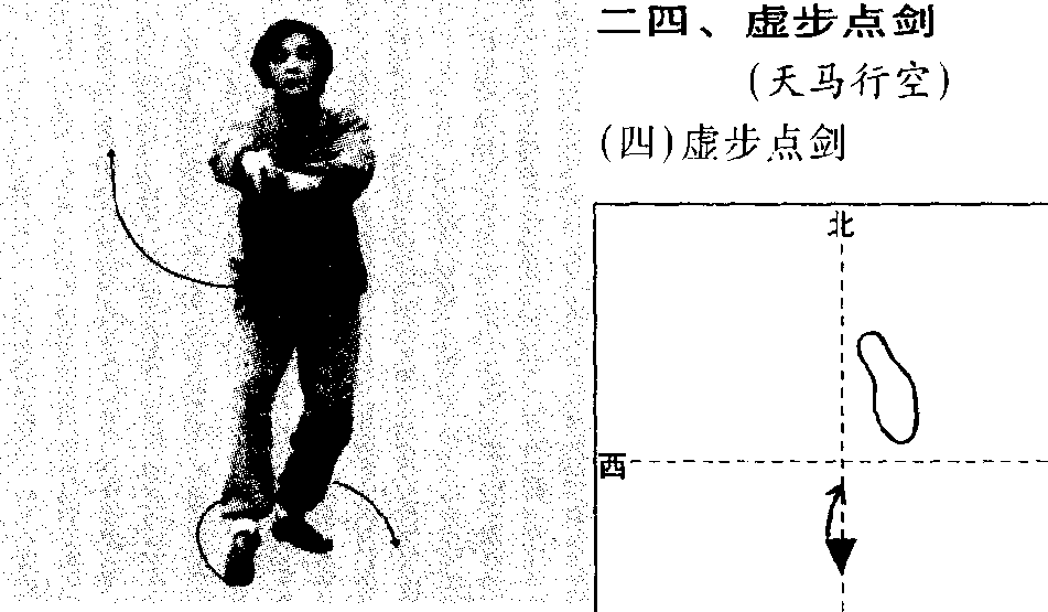 点剑时要活握剑把,右臂先向下沉落,再伸臂提腕,力注剑 尖。点剑与上虚步要协调一致。身体不要前倾。