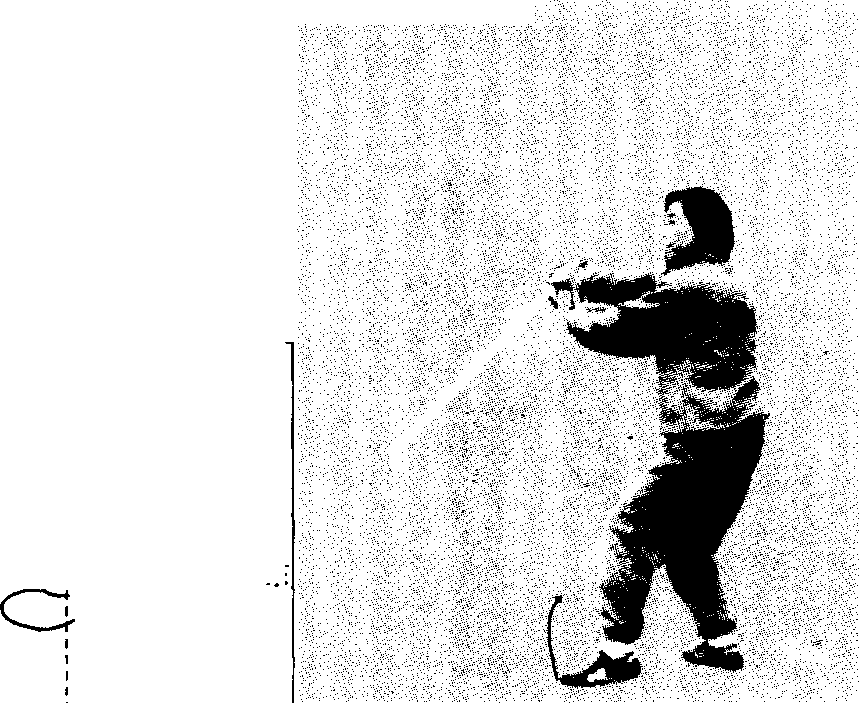 插步后身体重心仍在左腿。右脚向后插步,要与旋腕绕剑花 同时运行,协调一致。旋腕剑向右划弧时,注意剑尖稍向内收向 右上方划弧,剑尖向右。
