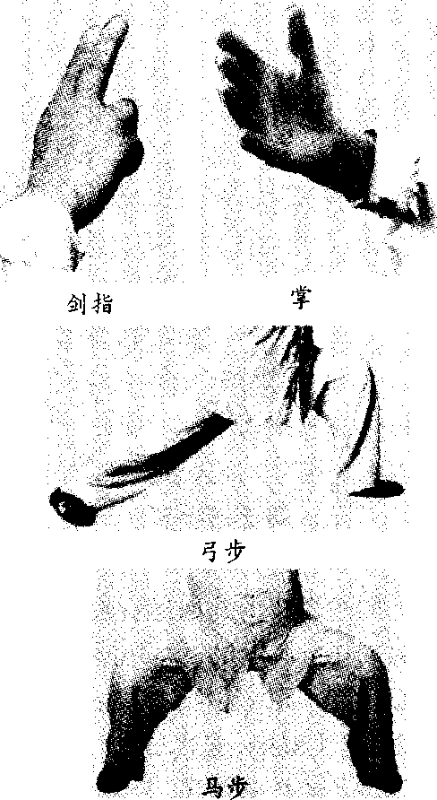 弓步前腿全脚着地,脚 尖朝前,屈膝前弓,膝部不得超 过脚尖,后腿自然伸直,脚尖斜 向前方,全脚着地,两脚横向距 离10?30厘米。