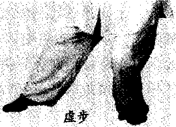 虚步一腿屈膝下蹲,全 脚着地,脚尖斜向前,约45。;另 一腿微屈,以脚前掌或脚后跟 点于身前。