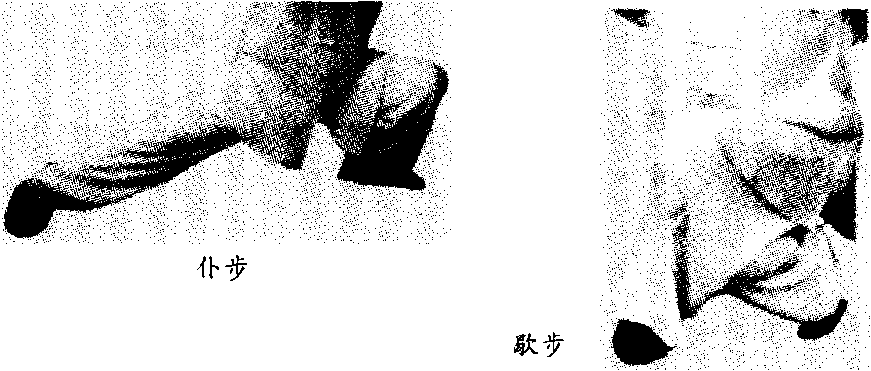 歇步 两腿交叉屈膝半蹲,前脚尖外展,全脚着地;后脚尖 朝前,膝部附于前腿外侧,脚跟离地,臀部接近脚跟。