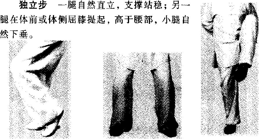 丁步 一腿屈膝半蹲,全脚着地;另一脚屈膝,以脚前掌或 脚尖点于支撑腿内侧。