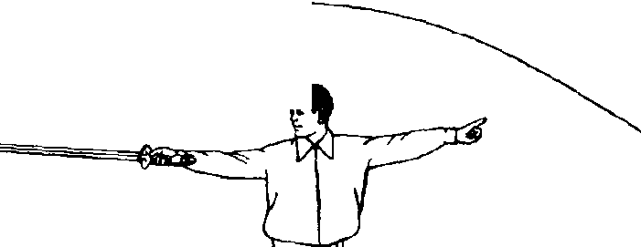 ①身体向右转,右脚向前横落盖 步,脚尖外撇,左脚跟离地成半坐盘 势;同时,剑尖下落,剑指下落到右腕 部,然后剑向后方立剑刺出,剑指向前 方指出,手心向下,两臂伸平,右手手 片心向体前;眼看剑尖(图四十三)。
