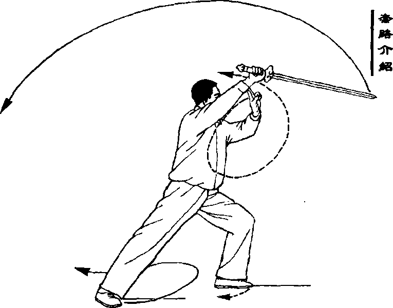 身体重心先移至右腿,左脚脚尖 里扣,然后再移到左腿上;右脚提起收 回(不停),身体向右后转,右脚随即向 前迈出成右弓步,面向中线右前方;同 时,剑随转体由上向右后方劈下,力在 剑刃;剑指由体前经左下方转架在左