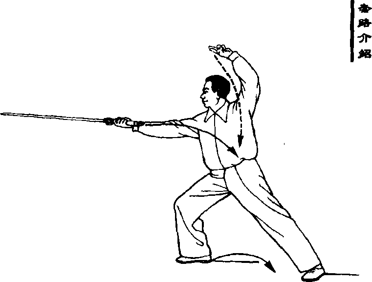 ②身体向左后转,左脚垫步,脚尖 外撇,继而右脚前进一步,成右弓步; 同时,剑随转体动作向前方刺出,力贯 剑尖,手心向上;剑指经体前顺左肋反 插,向后再向左上绕至左额上方,手心 斜向上;眼视剑尖(图五十四)。