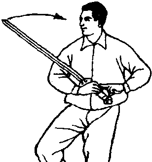 出,力在剑刃前端,手心斜向上,剑尖 斜向上,高与头平;剑指向左下方分开