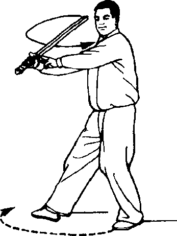 一大步,左脚跟外转,左腿蹬直,成右 侧弓步;同时,剑向右后上方斜削击