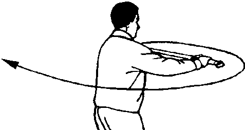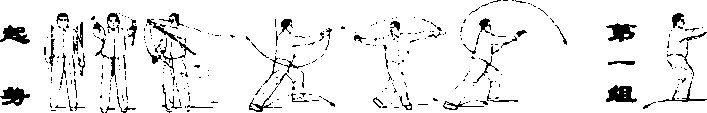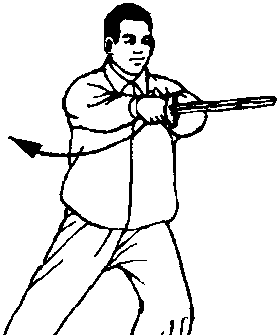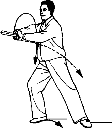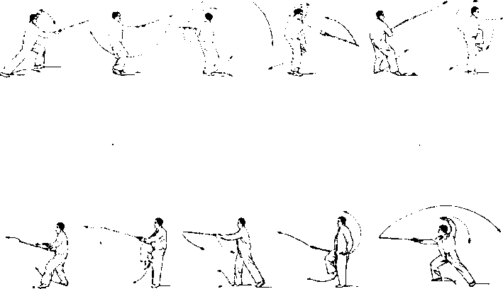 ①身体重心后移,随即身体向右 转;同时,剑向右后方回抽,手心仍向 内;左手也随即屈肘回收(两手心内 外相对),接握剑的护手;眼看剑身