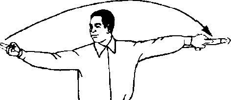 左手持剑(手 心向下)经胸前从右手上穿出,右剑 指翻转(手心向上),并慢慢下落撤至 右后方(手心仍向上),两臂前后展 平,身体后转;与此同时,右腿提起向