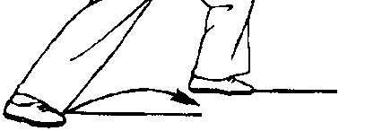 前横落,脚尖外撇,两腿交叉,膝部弯 曲,左脚脚跟离地,身体稍向下坐,成 半坐盘势;眼向后看右手(图五)。