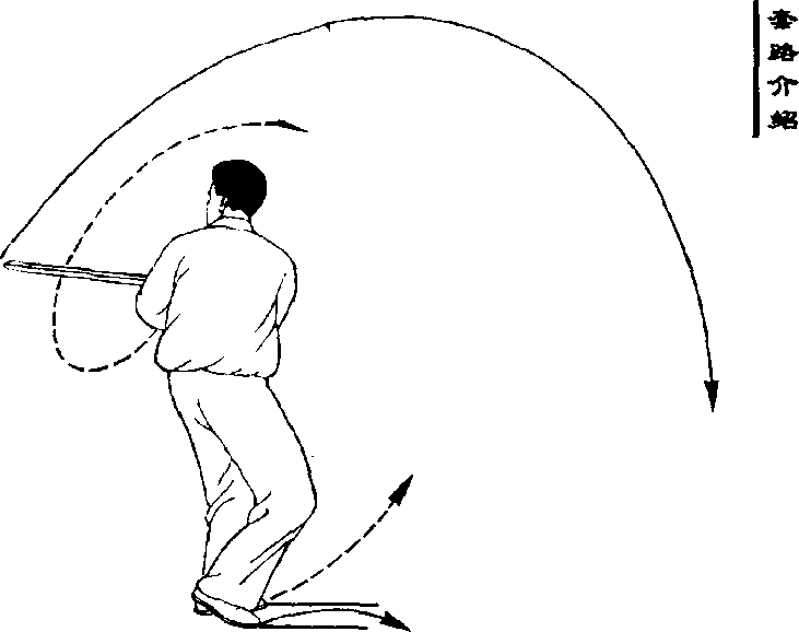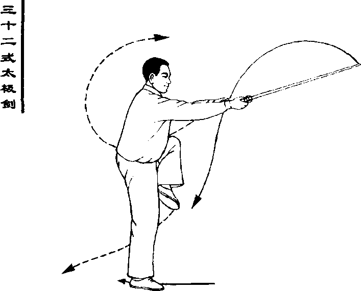 抡劈剑的同时,右脚前进一步,左腿 屈膝提起,成独立步;眼看剑尖(图十 五、十六、十七)。