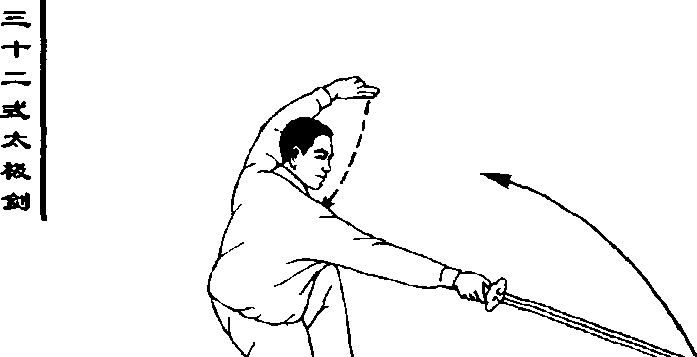 右脚前进到左脚内侧,脚尖着 地;左手从头部左上方落至右腕部; 然后身体左转,右手抽剑由前向下、 向后划弧,经身体左下方旋臂翻腕上 举,向前下方正手立剑劈下,力在剑 下刃;左手剑指则由身体左侧向下、 向后转至左额上方,掌心斜向上;在