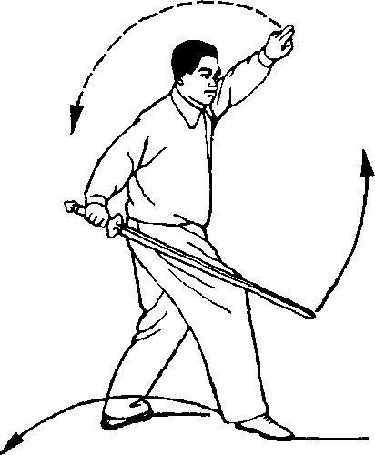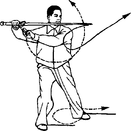 右脚向右后方回辙一步,左脚收 至右腿内侧后再向左前方迈出,成左 弓步,面向左前方;同时,右手剑随身 体转动经面前向后向下抽卷,再向左 前方刺出,手心向上,力注剑尖;左手 剑指向右、向下落,经体前再向左、向 上绕行至左额上方,手心斜向上,臂要