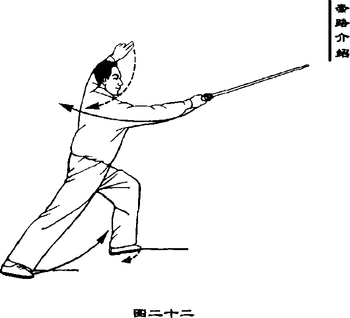 撑圆;眼看剑尖(图二十一、二十二)。