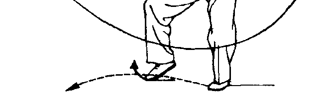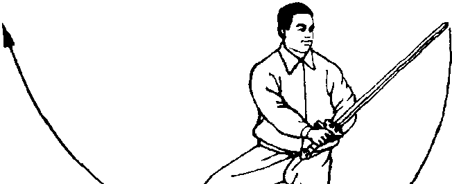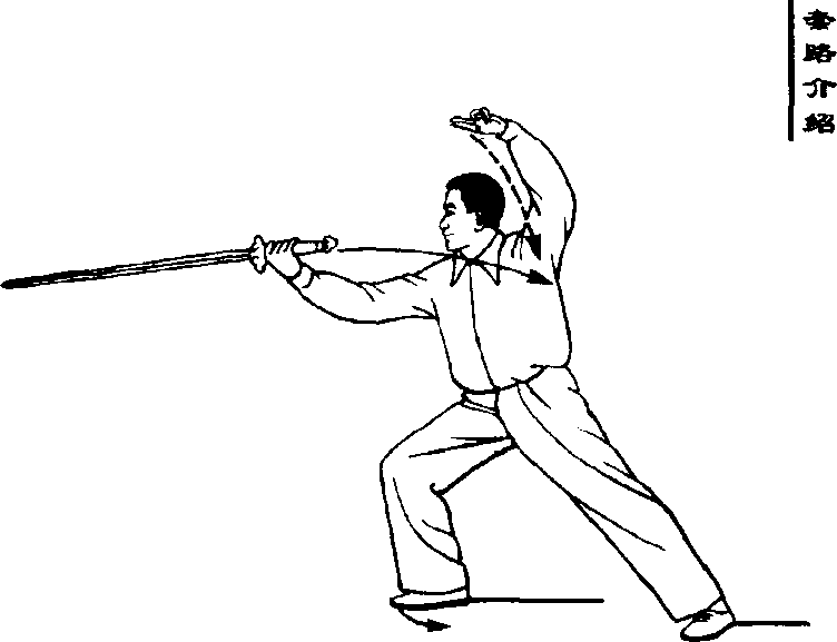 身体先向右转,剑由上向后绕 环,掌心向外,剑指随剑绕行附于右 臂内侧;随之左脚向前垫步,右脚继 而前进一步,成右弓步;右手剑随着 上右步由下向前立剑撩出(前臂外 旋,手心向外),剑与肩平,剑尖略低,