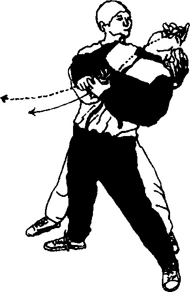 当乙用上法时甲速以左手反拿住乙左手小指经头上方绕至右肩外侧同时右臂顺势内旋,并急向左转体以左肩靠打乙之上身部位即可将其击败(图17)