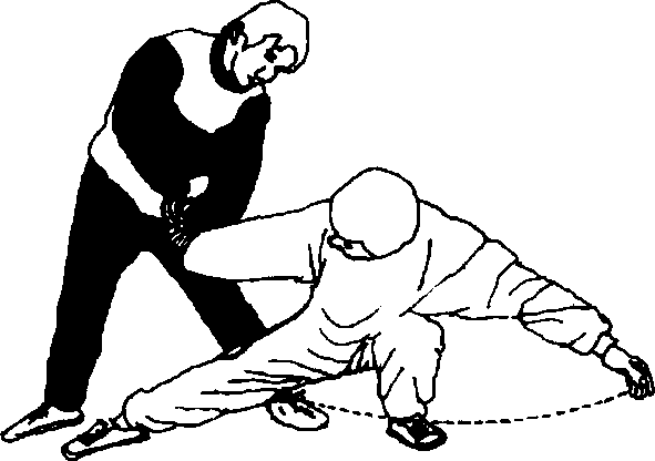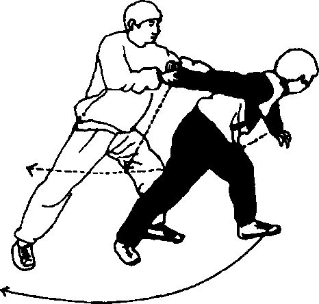 手压握乙之右手腕横纹下面必伤其脉使其难以松脱。制破乙之手技使其被动。目视双手。此时乙顺势左腿稍下蹲重心偏于左腿,左臂摆于左侧目视右手(图19123)。