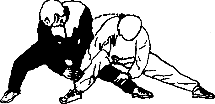 当甲用上法时乙尽量松弛右手运用内劲集中于左手四指上拇指在上、虎口向右。拿甲左小腿——足太阳和足少阴经的外端使甲之小腿发生酸麻使其产生筋麻的同时右臀部必须坐压在甲之左腿上以加重点拿之劲而反使甲处于被