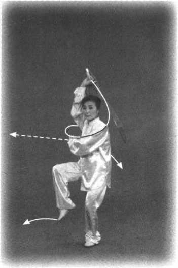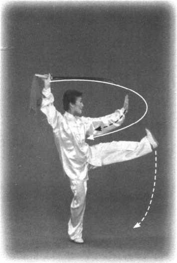 左脚内扣,右脚提起向右后 转身。右手持刀屈腕上提,刀背 向里贴肩背从右向左裹脑;左掌 立于右腋下。口随刀动。