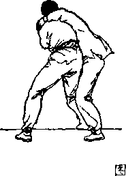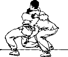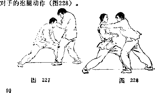 (1)防抱腿:当对手身体前俯欲抱腿肘(图227), 你迅速降低重心十身体前倾,两手向前推阻对手两肩,破坏