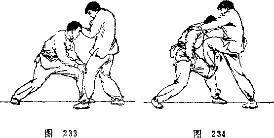 (1)防抱腿、当对手身体前俯欲抱腿时(图233),你 迅速降低更心,身体前倾,两手向前下按扶对手两肩*随即 前腿屈膝上撞,破坏对手的抱腿动作(图234).