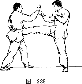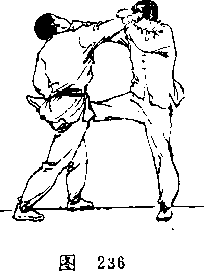 (2)防抱腿摔,(以右艇为例)当对手抱住你右腿, 欧用右手抹击颈部、右脚勾踢摔你时(图235),你左手迅速