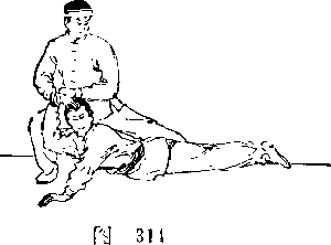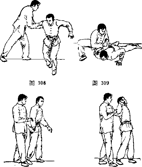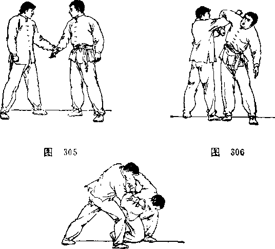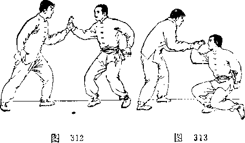 成即右腿后撤,上体右转,两手同时折叠其腕、下庄后批,将 对手拉倒擒获(图314).
