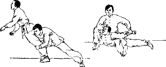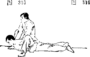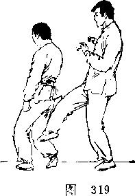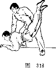 由后插入其裆,随即猛力后拉 上提,同时右脚迅速上步,右 ?手以掌刃(手掌小指侧缘)猛 砍HI序,两手合力将其摔倒 (图318)$然后诅理上步坐骑' 抓发、夹肘(参见图316,317) 以擒之。