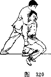 锁喉夹肘*你从启方接近对手时,用右脚猛盥其膝 窝(海319),乘其后仰之际,将右前臂插入其颁下,以挠骨删 紧淡其喉,左手抓己右手腕并助力,两手合力向后拉搜,同 时右脚着地*右肩向前顼送其头,用合力锁牢其喉(图320、 随后’向左后转身将对手按倒,随即骑坐其腰,拽发、夹肘 (参见图316、317)c