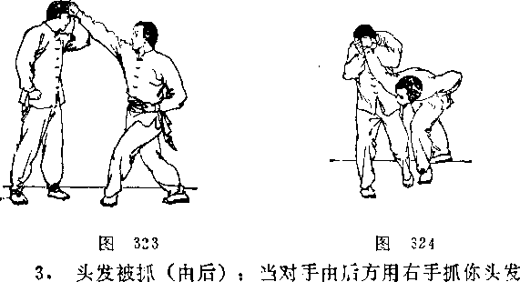 2-头发被抓(由前):当对手由前用右手抓拉你头发 时,你迅速用左手按压其手背,将其手固定于头上(图323); 随即用右手迅速按制其手腕,紧接着用左手掌刃猛力顶压其 右手腕外侧,同时后撤右腿向右后转体以助两手之力,使对 手手腕受制就擒(图324)o
