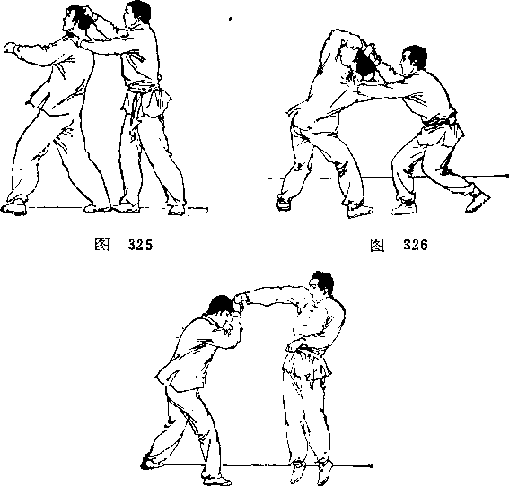 时(图325),你迅速边向右后转身边用两手将其右手抓握并 固定在头上(图326)§随即将头稍下沉,同时两手将对手的 手腕外翻至手心朝上,随之迅速抬头,两手猛力向上折其 腕,迫使对手因腕部被制而就擒(图3”)°