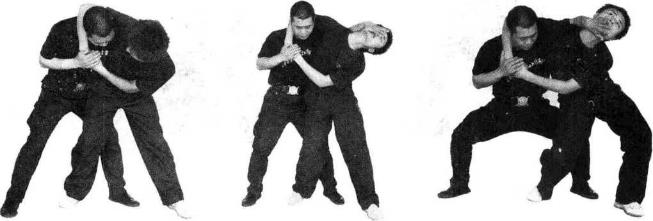 图3-6-72图3-6-72当对方右夹颈夹住我颈部时我重心迅速下沉左手由其右腋下穿过上推于其右侧面部右手向上挑脱其右小腿上掀,然后挺腰向左后转体将其摔出达到解脱的目的(图3-6-73、3-6-743-6-75图3-6-72图3-6-723-6-763-6-77)图3-6-73图3-6-74图3-6-75图3-6-76图3-6-77要点重心下沉快左手推头颈部有力右手挑打其右小腿要猛上下配合连贯一致发力要短促。易犯错误及纠正方法推头不到位不准确下挑腿没有力后挺腰不够。