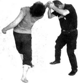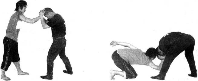 要点按手背紧而及时踢裆、勾头、弯腰要猛连贯一致。