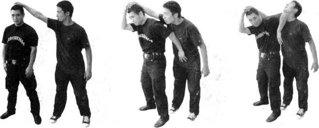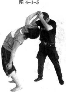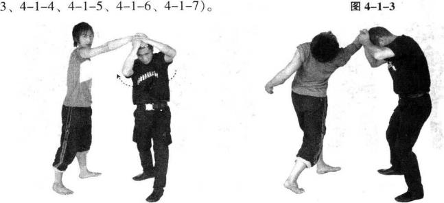 顶腕当对方从侧背后抓你头发时即可快速后撤右步并向右后转体同时双手按压其右手背低头前顶挺腰立身(图4-1-
