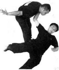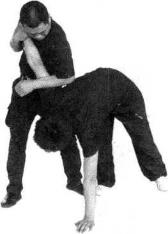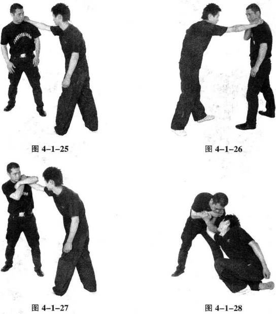 右手按压于对方右膝关节外然后左手拉带其右肘部右肩顶扛其右腋窝右手按住其右膝外向左后转体三者合力将对方摔倒(图4-1-29、4-1-30、4-1-314-1-32)。