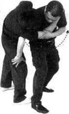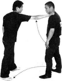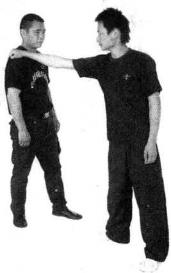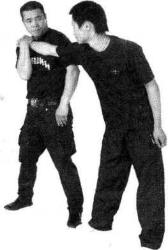 图4-1-33图4-1-33当对方用右手反抓我右肩我顺势用右手按压其右手腕处然后上左步右转体用左肩和左手大臂部借助对方抓肩的力量猛撞击其右手肘关节处达到解脱的目的(图4—1—33、4-1-344-1-35)