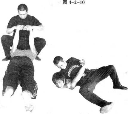 2 与对方相对成跪撑用左手臂反卷夹锁住对方颈部同时用右手抓住其右腕下压将其右肘关节抵在右侧大腿上或懿腹部用左腿抵住其后背使对方成半仰卧被控制。此法可以将对方完全控制在仰卧状态(图4-2-13、4-2-14)
