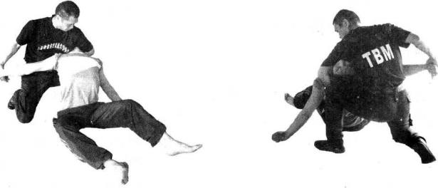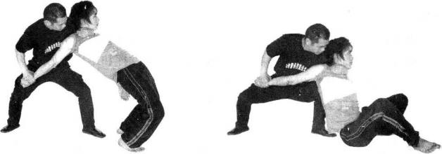 3从对方背后用右手臂夹锁其颈部用左手抓住其左腕向后拉其左臂将其坐立控制(图4-2-15、4-2-16)
