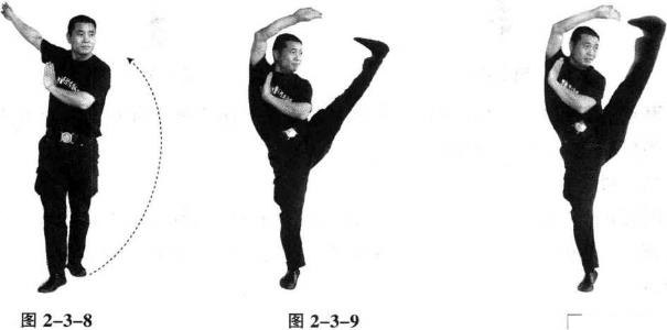 两脚并立两臂侧平举立掌右脚向前上半步左臂前伸右臂后举左脚脚尖勾紧向左耳侧踢起同时右臂上举掌心朝上用手掌尖触摸左脚尖左手立掌放于胸前抬头眼向前平视依次交替。也可先踢左腿后踢右腿(图2-3-8,2-3-92-3-10)要点挺胸直腰抬头、侧身。图2-3-10