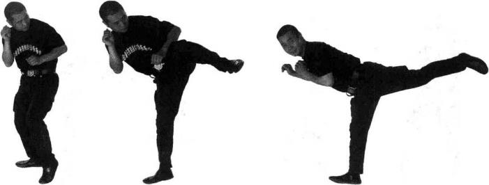 身体向左后转两腿弯屈成跪步右手护头左手屈肘自然下垂置于体侧右腿直立或稍屈支撑左腿抬起由屈到伸勾脚脚尖朝下脚跟领先向后蹬出力达脚跟上体前俯眼看蹬腿方向(图3-4-29、3-4-30,3-4-31)