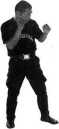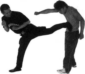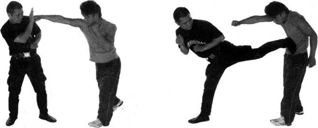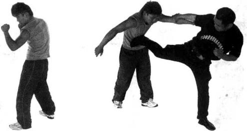 例2插步后蹬。双方伺机进攻而距离较远时后腿插步接近对方后蹬腿击打对方胸部(图3-