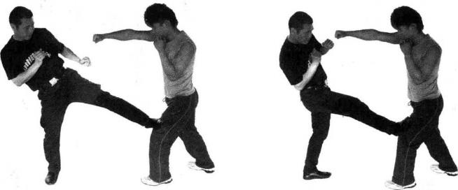 当对方用拳进攻时抢先以截腿封堵对方(图3-4-84、3-4-85)