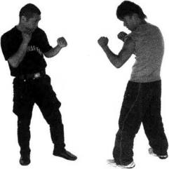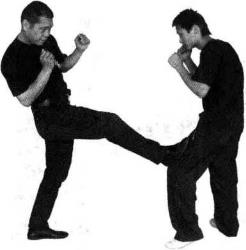 当对方进步上前靠近欲进攻我时快速以左腿低侧踹截其小腿正面(图3-4-823-4-83)