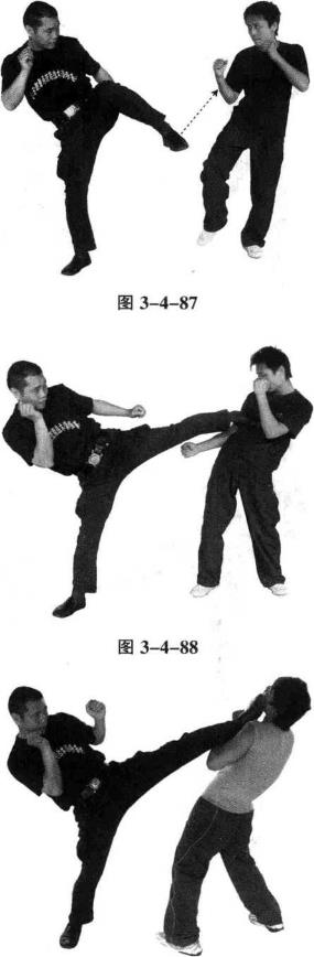 右截腿虚晃进攻对方下盘当其提膝防守或后撤时随右腿前落右转身用左踹腿进攻对方中、上盘(图3-4-86、3-4-873-4-88)