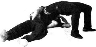 当对方用右直拳击我头部时。我迅速上步右闪身抱其腰部右腿屈膝上步后蹬腿向后弓腰、仰头将对方抱起向后倒地的同时弓腰、仰头头离地约20厘米时转体将对方摔于身下(图3-6-22、3-6-233-6-243-6-25)图3-6-24图3-6-24图3-6-25图3-6-25图3-6-24图3-6-24图3-6-25图3-6-25要点抱腰要紧仰头、挺腹、蹬腿协调要有力转身翻腰及时。易犯错误及纠正方法(一)抱腰不紧。应主动接近对手。(二)自己先倒地。蹬腿应及时有力翻腰后倒大胆迅速掌握好时机。作用适用于对方主动进攻或防守反击。