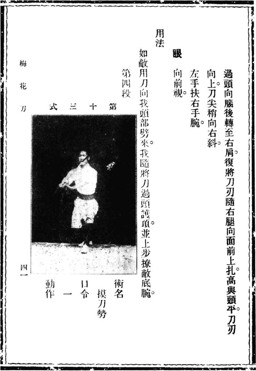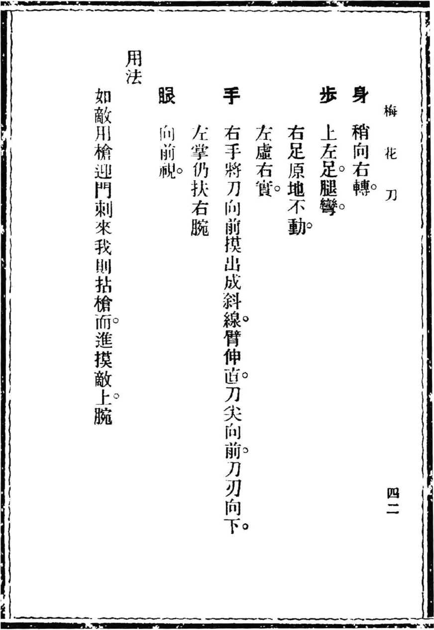 身:稍向右转。步:上左足,腿弯。右足原地不动。左虚右实。手:右手将刀向前摸出成斜线,臂伸直,刀尖向前, 刀刃向下。左掌仍扶右腕。眼:向前视。用法如敌用枪迎门刺来,我则拈枪而进,摸敌上腕。